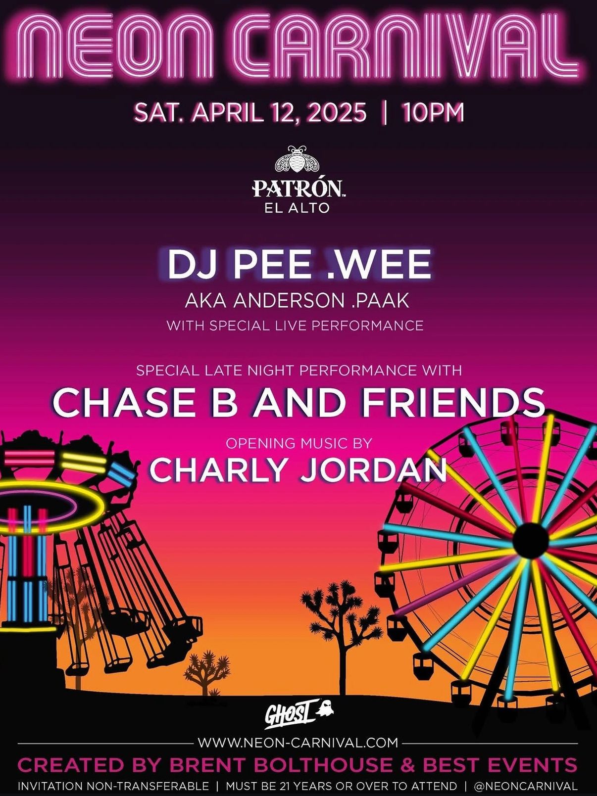 Neon Carnival 2025 was one for the books! If you were not there you missed out on the best after party in the desert! PATRÓN EL ALTO was giving main character vibes; guests had the opportunity to sip on delicious margaritas served on a collector's cup and did we mention they had exclusive mini bottles! PATRÓN EL ALTO really kept the party going with Charly Jordan. Anderson .Paak, DJ Pee .Wee, Chase B and Friends Pharcyde, Too Short kept the party going till 4 am!